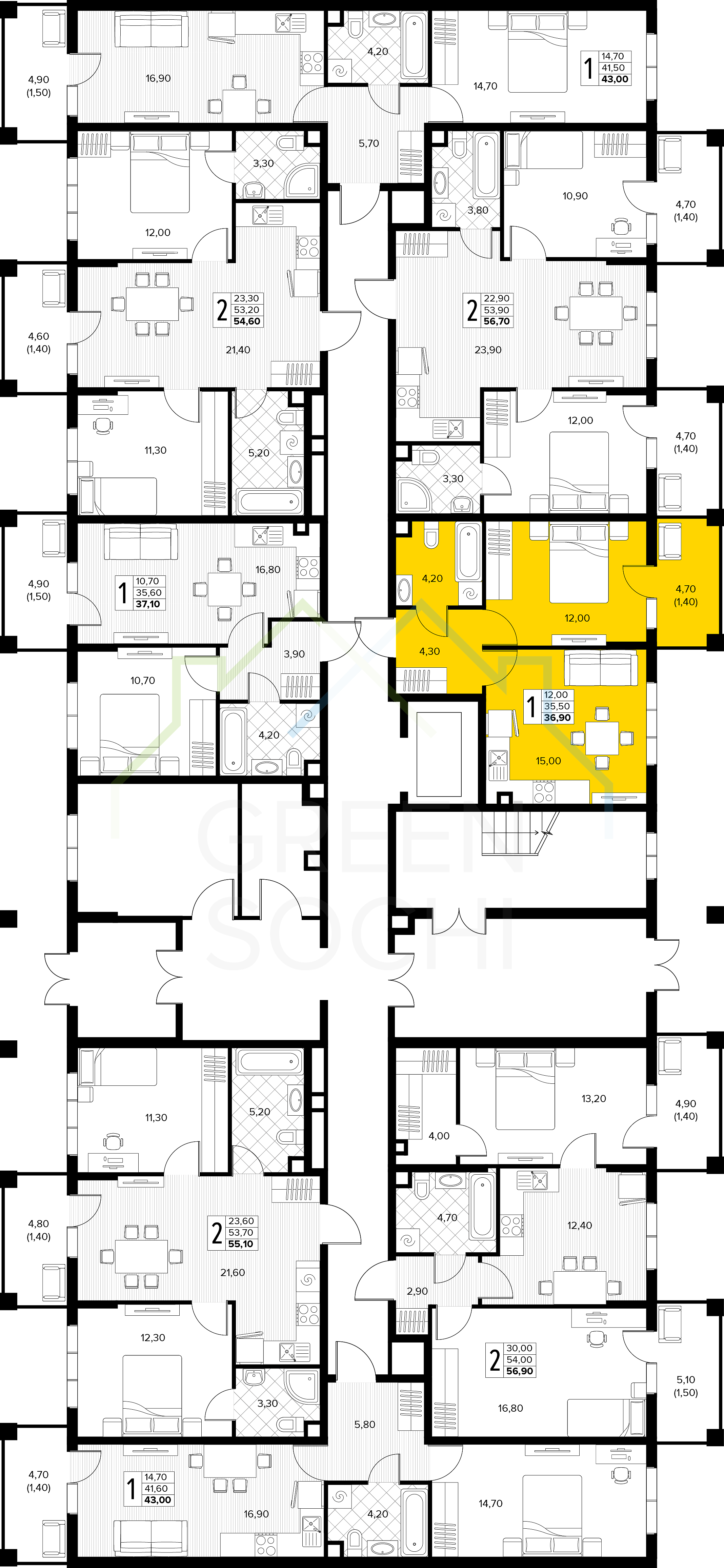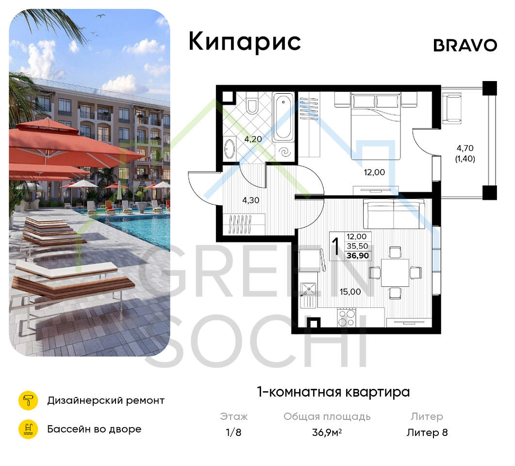 1-к квартира, 36 кв.м., в ЖК Кипарис (Холидей Хаус) (№14881)
