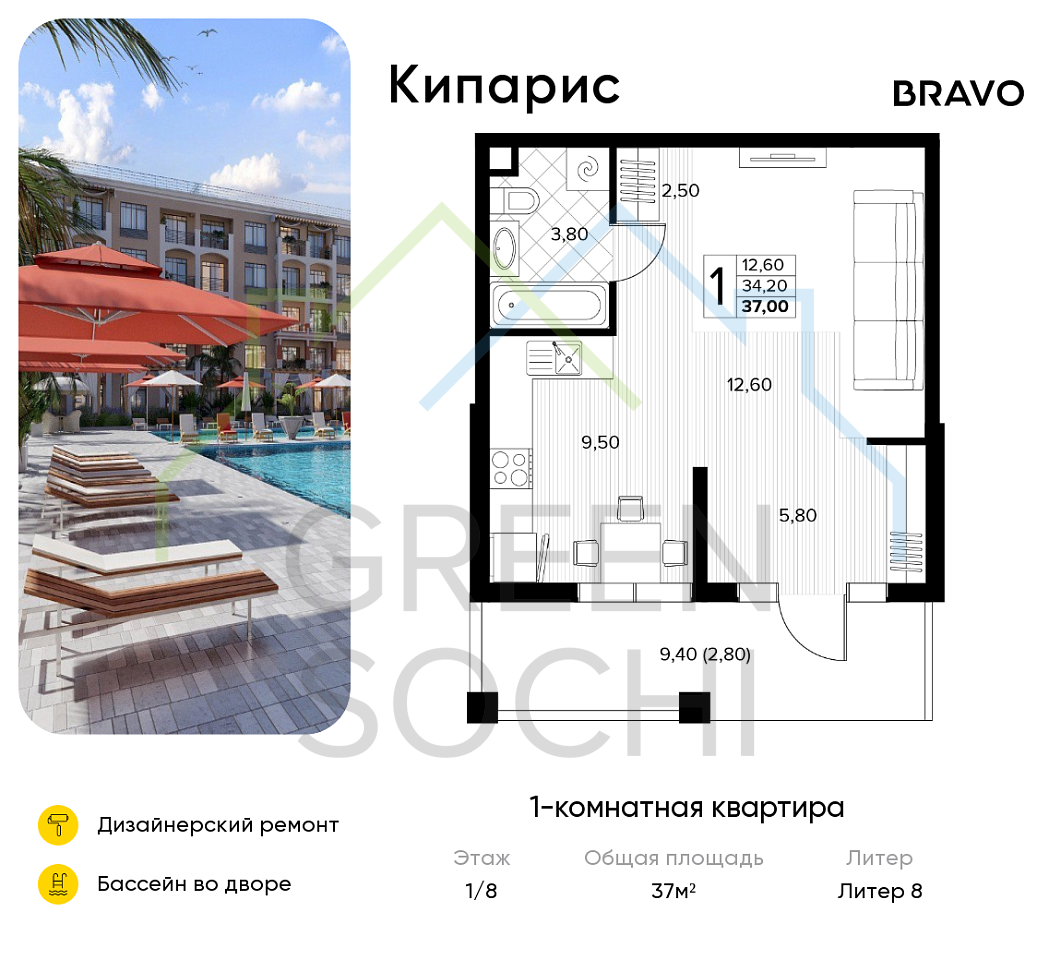 1-к квартира, 37 кв.м., в ЖК Кипарис (Холидей Хаус) (№14861)
