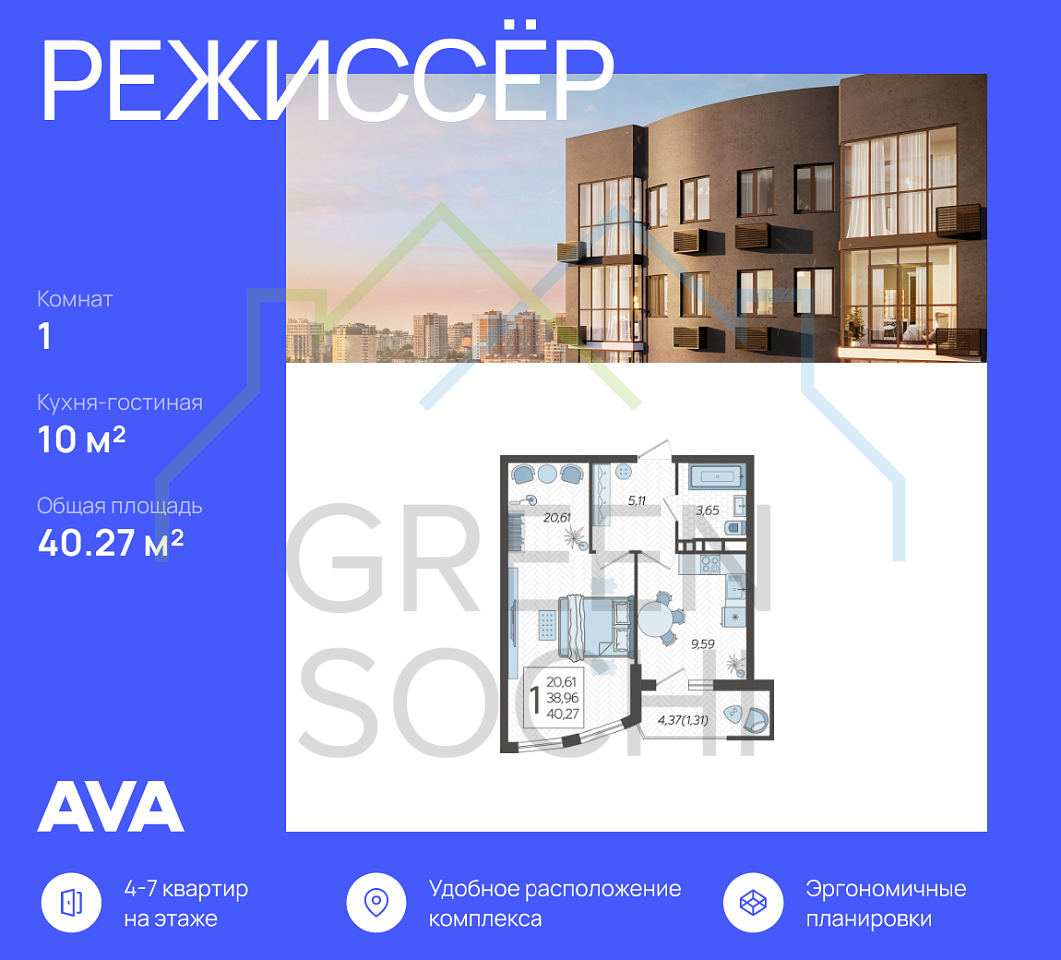 «Режиссёр» — жилой комплекс комфорт-класса в Краснодаре. Здесь представлены 1–3-комнатные квартиры и апартаменты площадью от 37,8 до 194,1 м². Покупатели могут выбрать из 3 вариантов отделки. В ЖК предусмотрены закрытый двор, трёхуровневый подземный паркинг, на первых этажах откроются коммерческие объекты. Сдать ЖК «Режиссёр» планируется в IV квартале 2025-го — I квартале 2026 года.