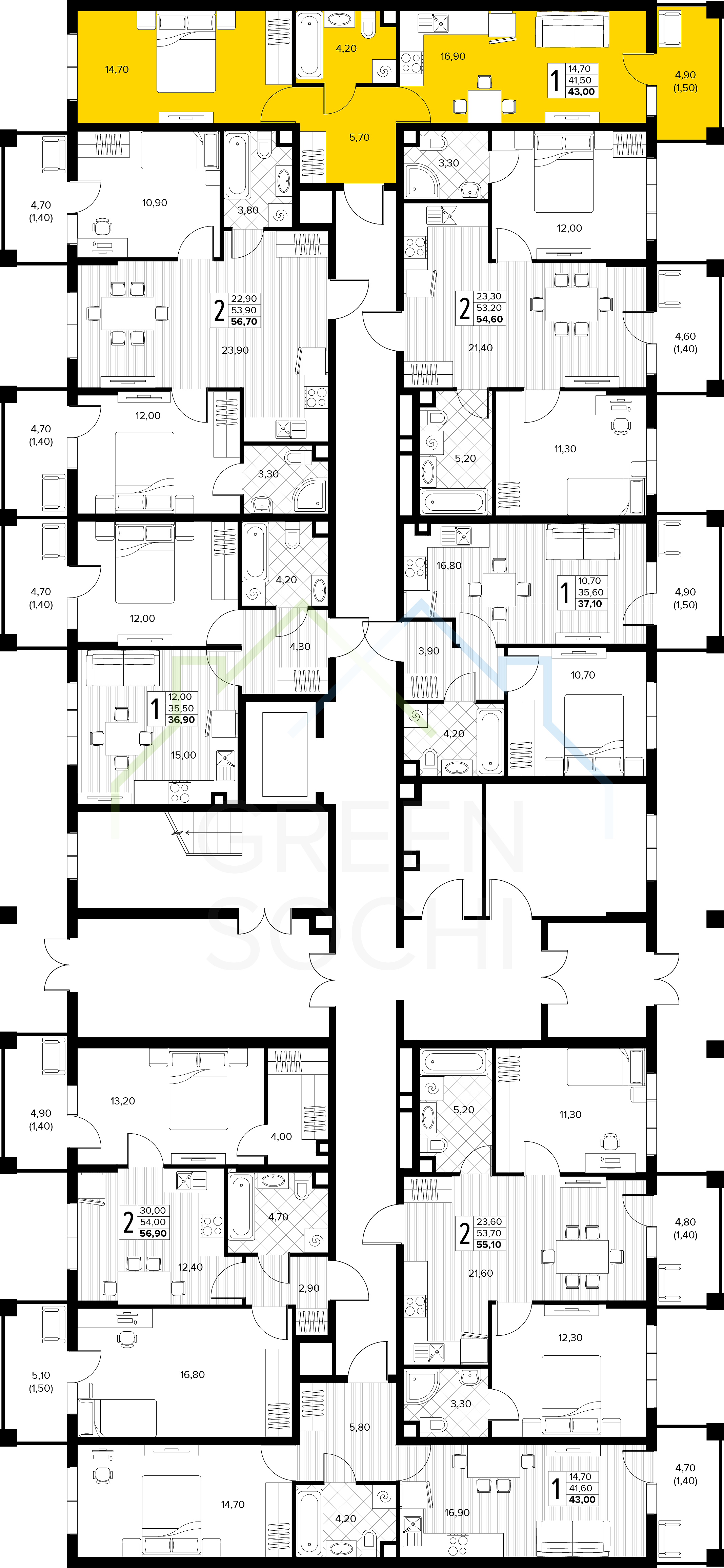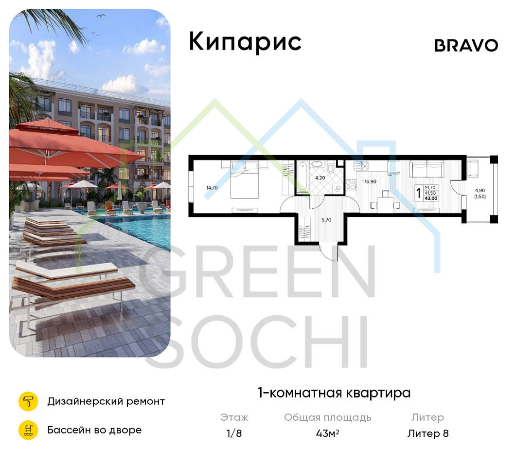 1-к квартира, 43 кв.м., в ЖК Кипарис (Холидей Хаус) (№14868)