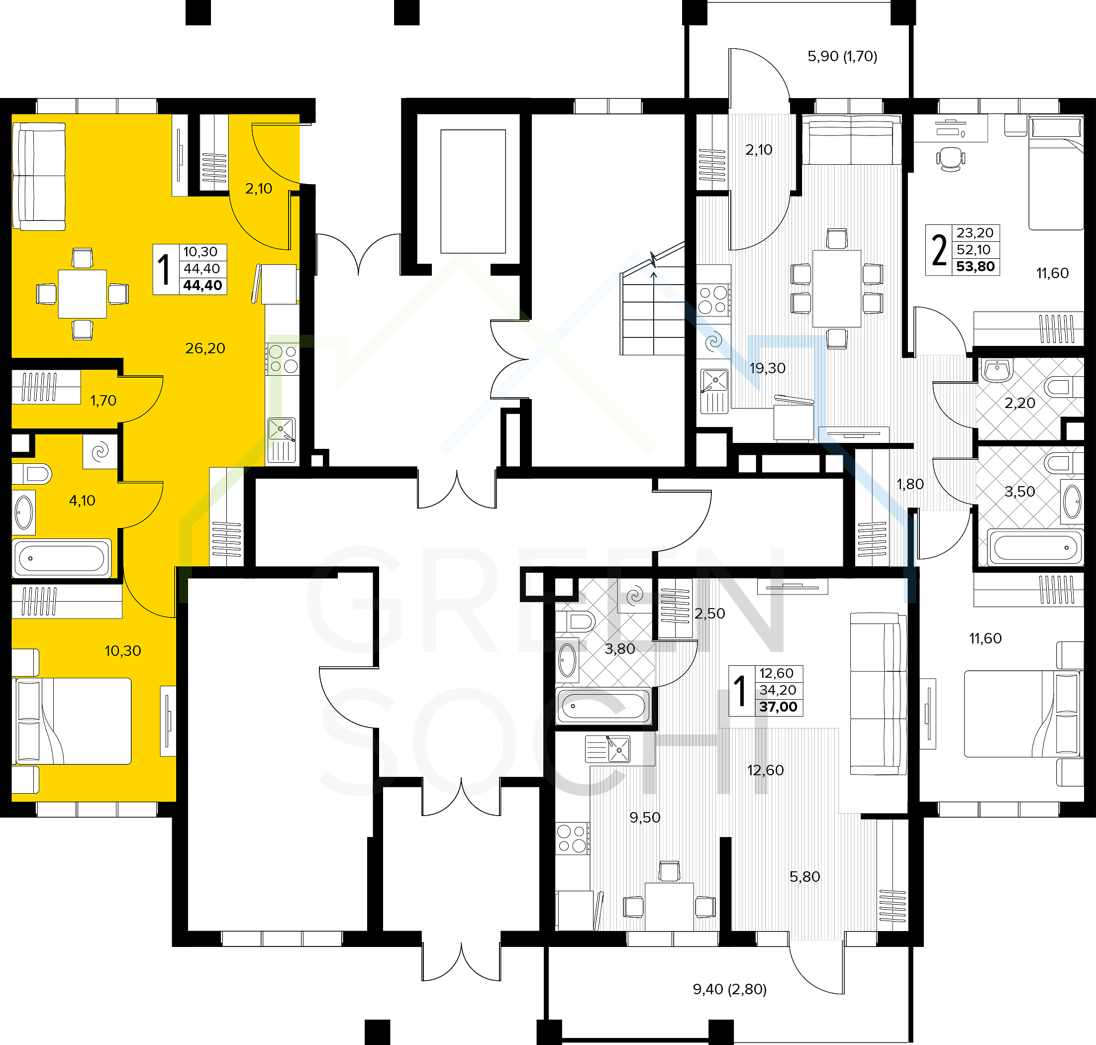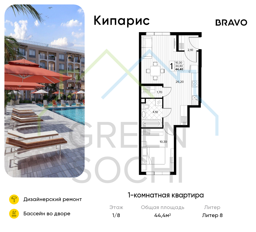 1-к квартира, 44 кв.м., в ЖК Кипарис (Холидей Хаус) (№14862)
