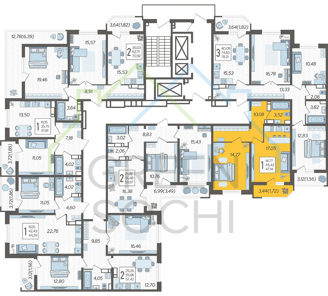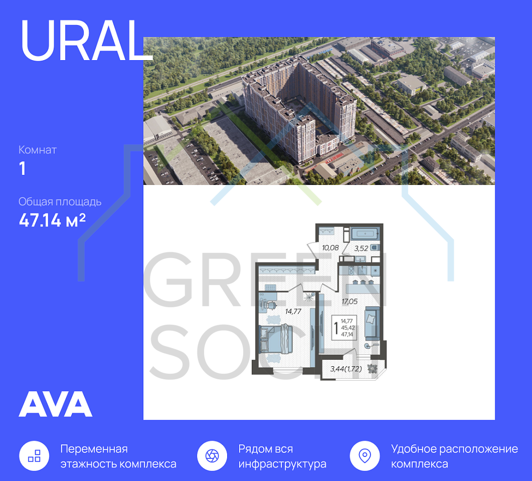 Продаётся 1-комнатная квартира в строящемся доме (Дом Литер 1), срок сдачи: 1 кв. 2025, общей площадью 47.14 кв.м., на 17 этаже. Без отделки, но с возможностью заказать отделку