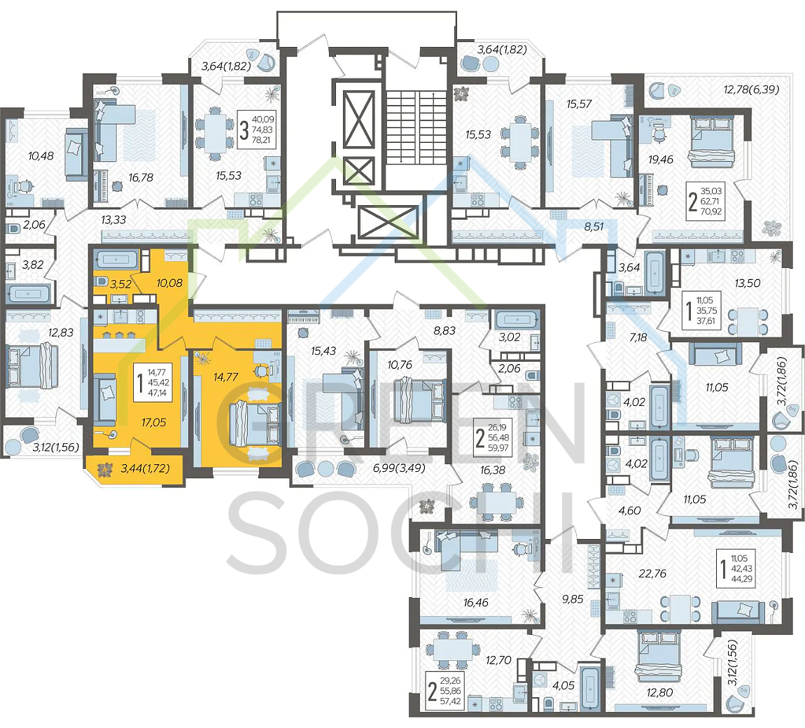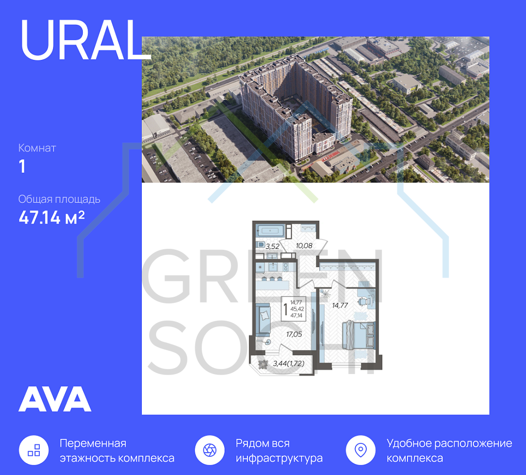 Продаётся 1-комнатная квартира в строящемся доме (Дом Литер 1), срок сдачи: 1 кв. 2025, общей площадью 47.14 кв.м., на 17 этаже. Без отделки, но с возможностью заказать отделку