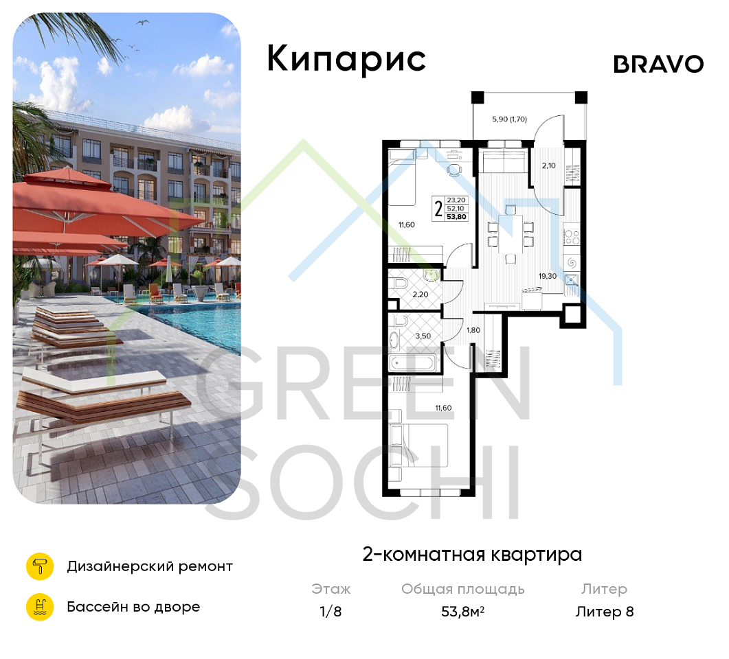 2-к квартира, 53 кв.м., в ЖК Кипарис (Холидей Хаус) (№14884)