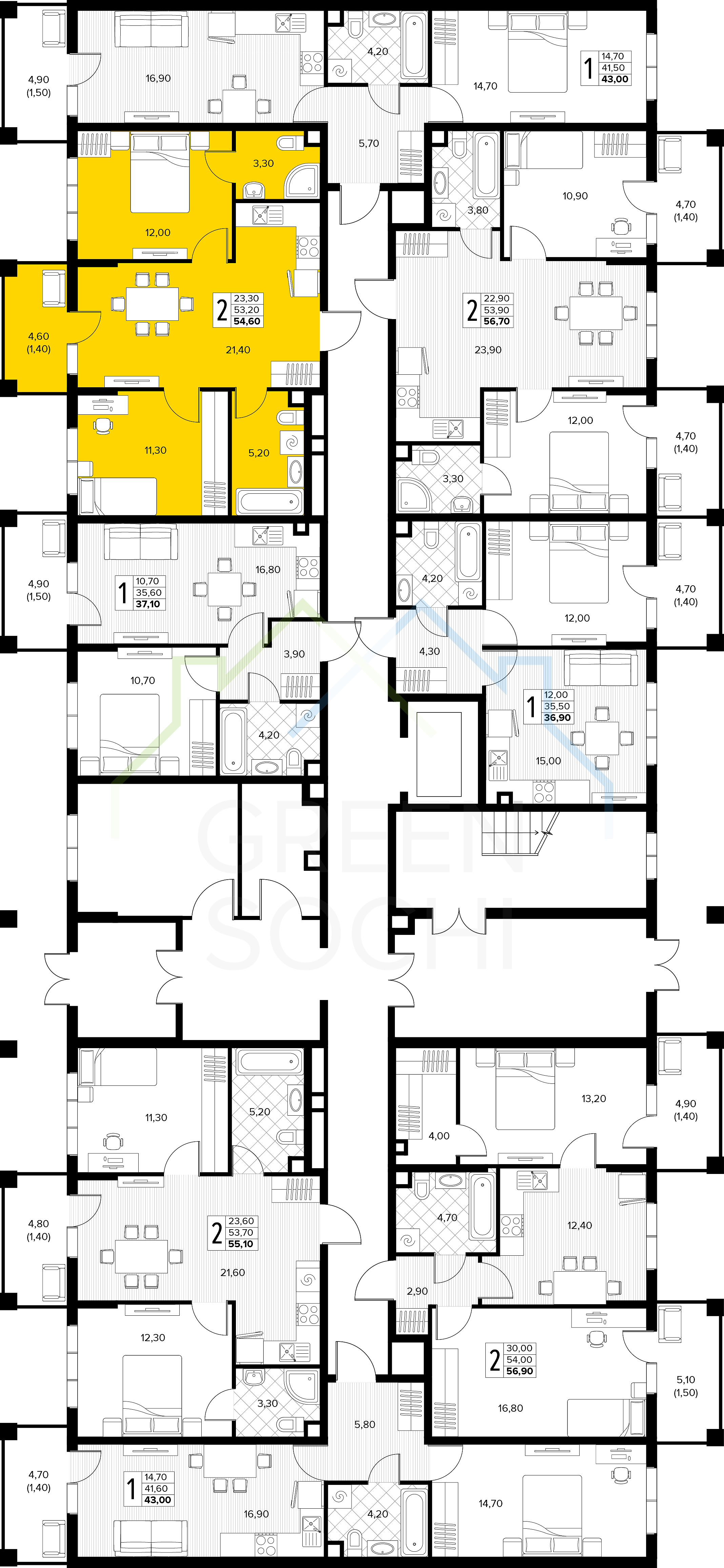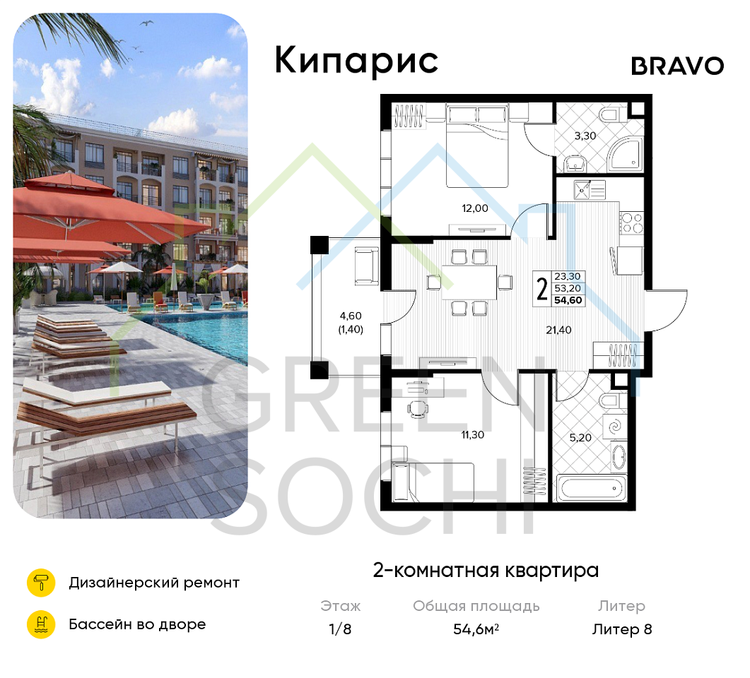 2-к квартира, 54 кв.м., в ЖК Кипарис (Холидей Хаус) (№14878)