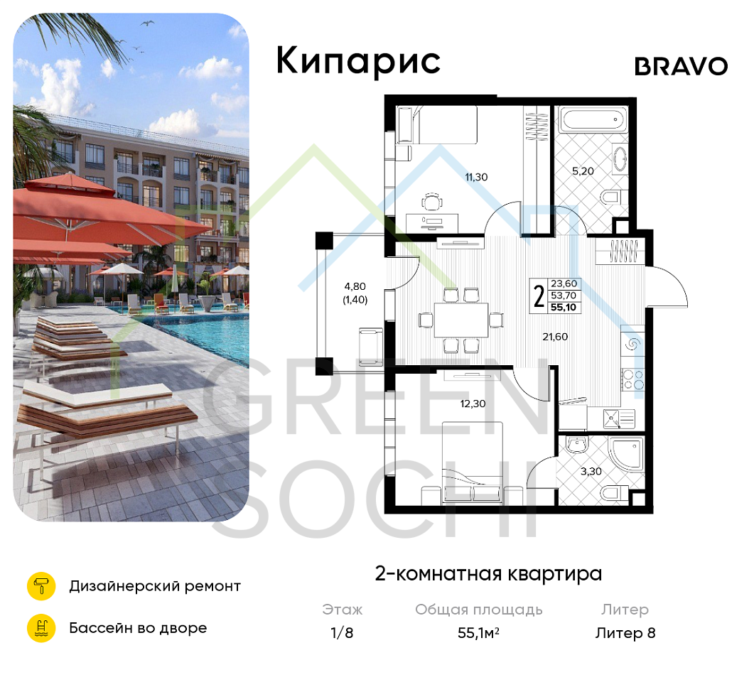 2-к квартира, 55 кв.м., в ЖК Кипарис (Холидей Хаус) (№14876)