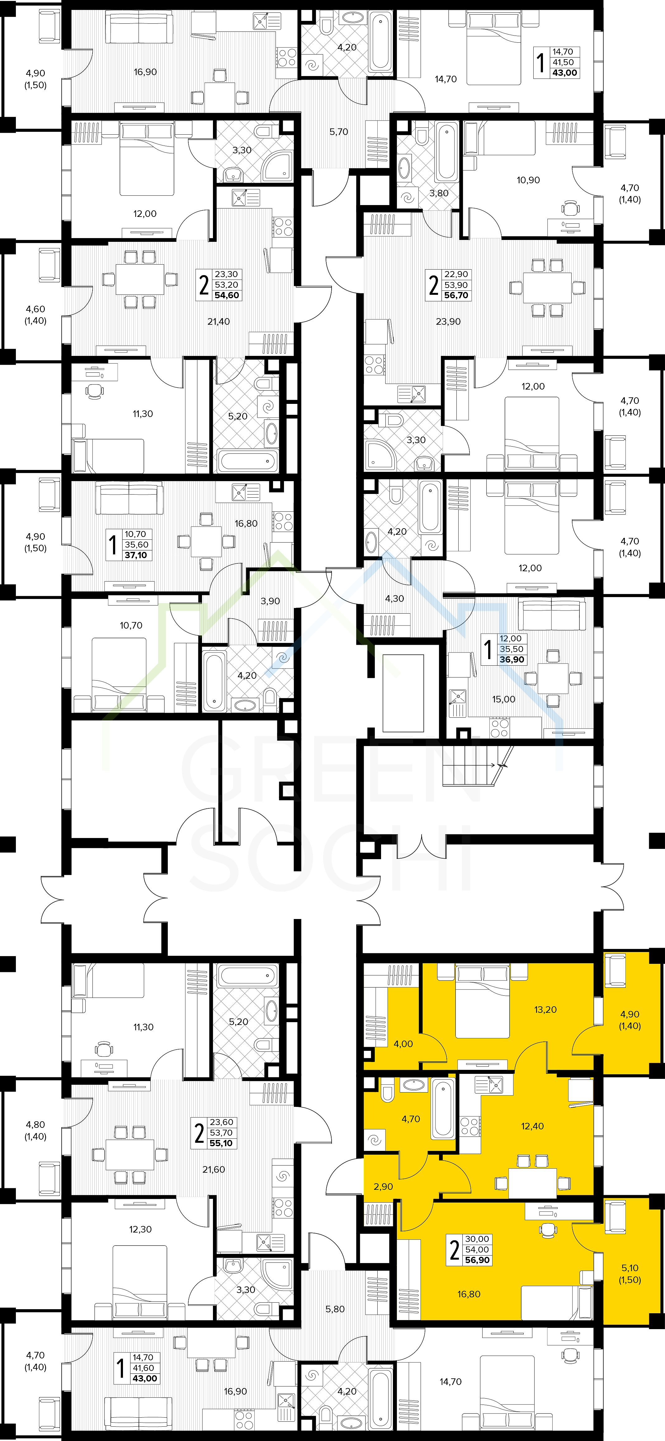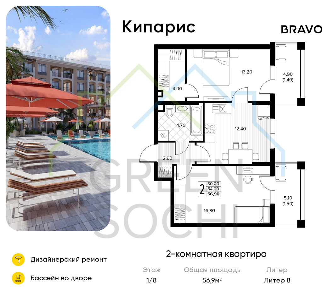 2-к квартира, 56 кв.м., в ЖК Кипарис (Холидей Хаус) (№14874)