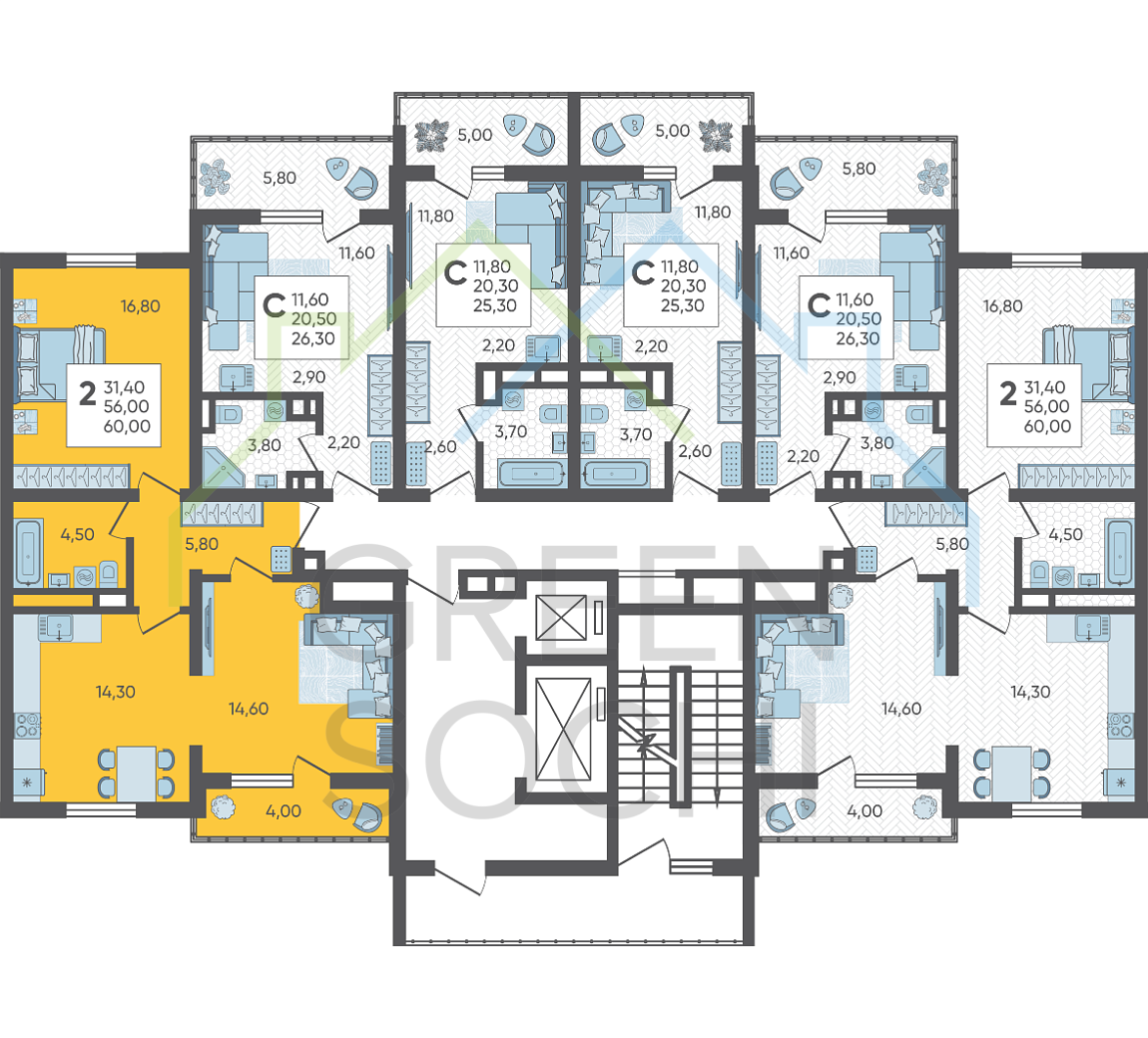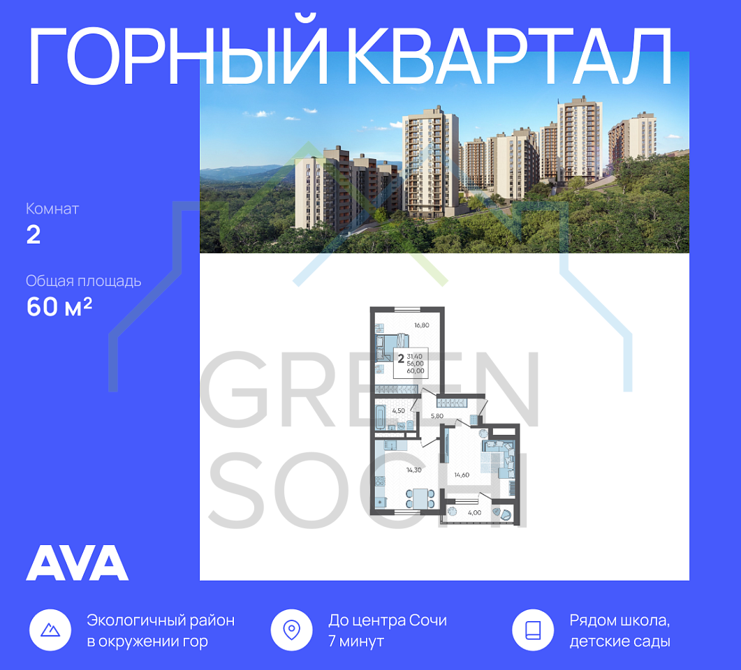 Продается 2-комнатная квартира в доме (Литер 4), срок сдачи : 3 кв. 2026, общей площадью 60 кв.м., на 5 этаже в новом современном жилом комплексе в Сочи «Горный квартал», Хостинский район. Отличный вариант для инвестиций и жизни.