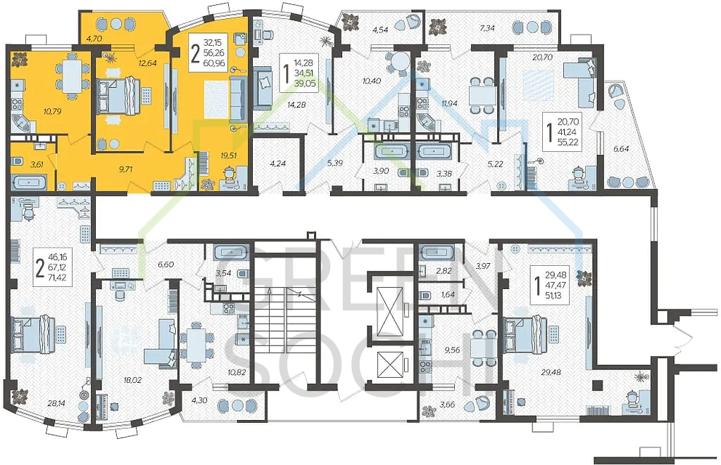 От 4-х до 7 квартир на этаже. Одно из важных преимуществ при выборе квартиры – не много соседей рядом.Лифт, который спускается в подземный паркинг и больше количество парковочных мест сделает жизнь в ЖК “Режиссёр” еще комфортнее!