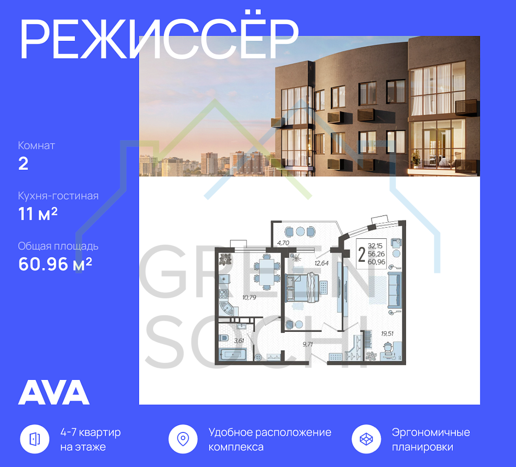 2-к квартира, 60 кв.м., в ЖК Режиссер (№13983)