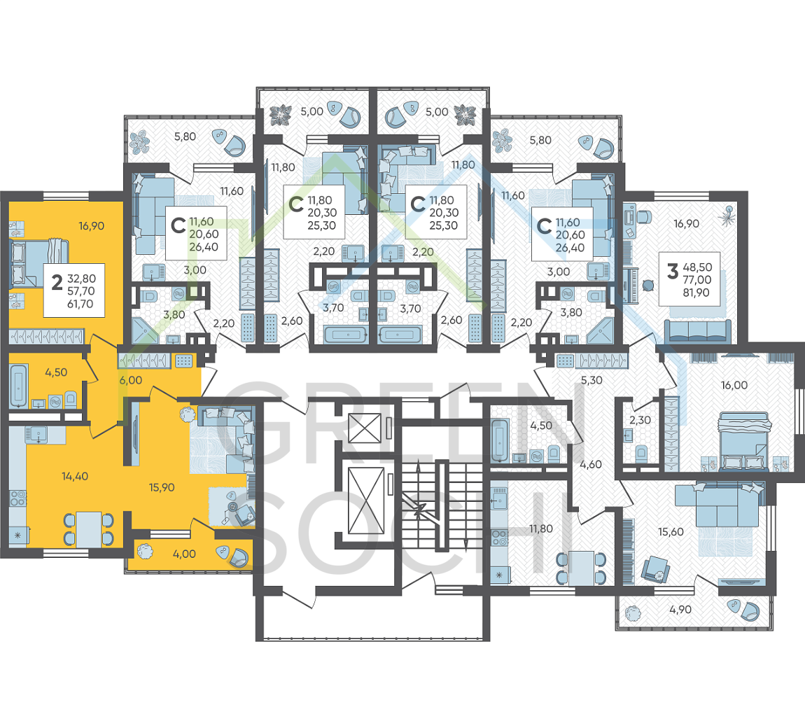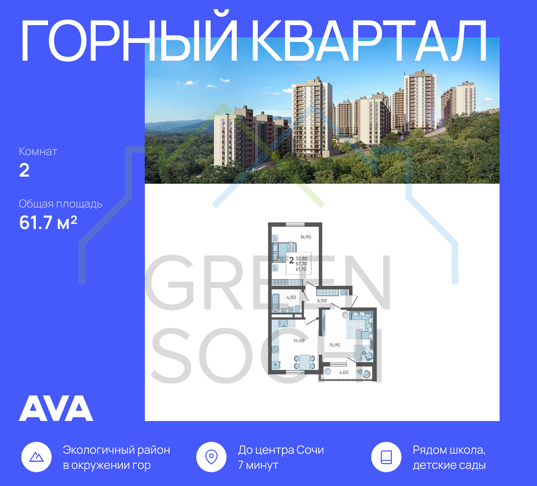 Продается 2-комнатная квартира в доме (Литер 1), срок сдачи : 3 кв. 2026, общей площадью 61.7 кв.м., на 10 этаже в новом современном жилом комплексе в Сочи «Горный квартал», Хостинский район. Отличный вариант для инвестиций и жизни.
