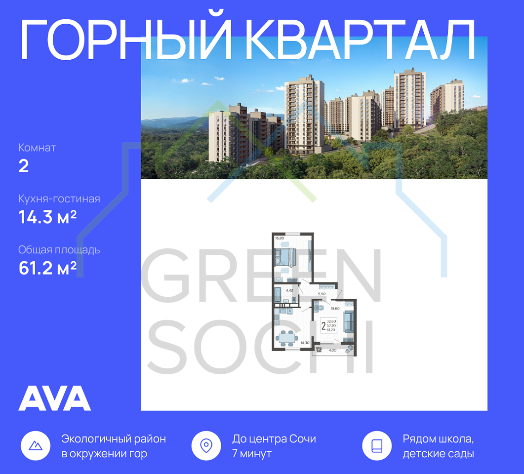 Продается 2-комнатная квартира в доме (Литер 2), срок сдачи : 3 кв. 2026, общей площадью 61.2 кв.м., на 2 этаже в новом современном жилом комплексе в Сочи «Горный квартал», Хостинский район. Отличный вариант для инвестиций и жизни.
