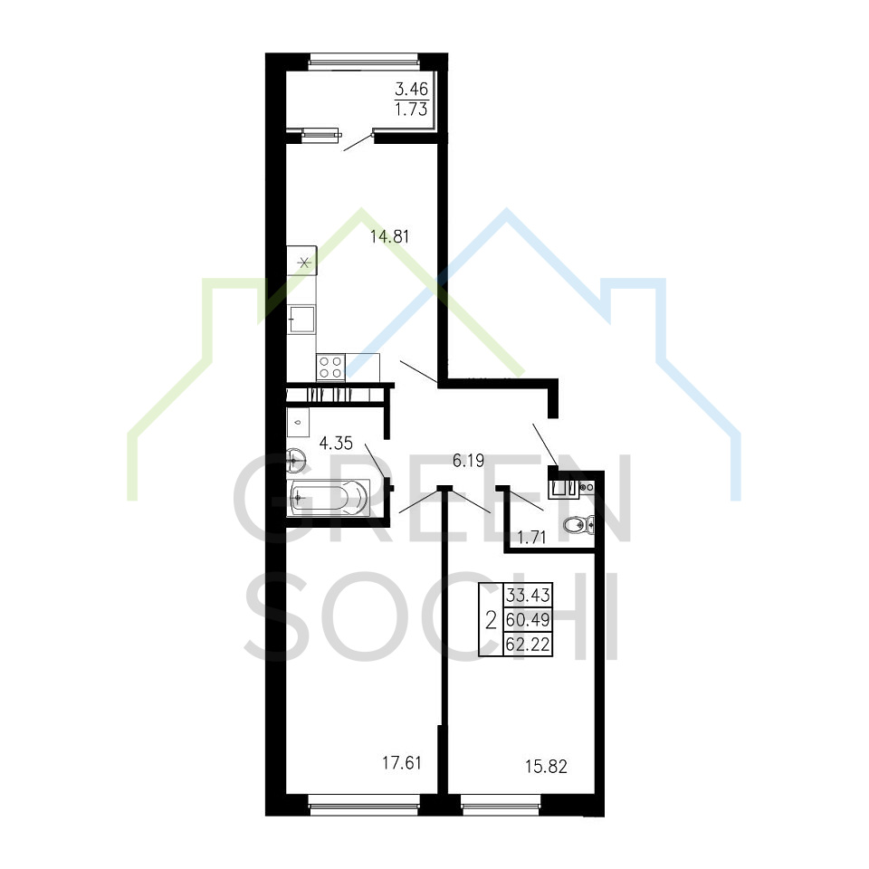 Общая площадь 62.22 м2