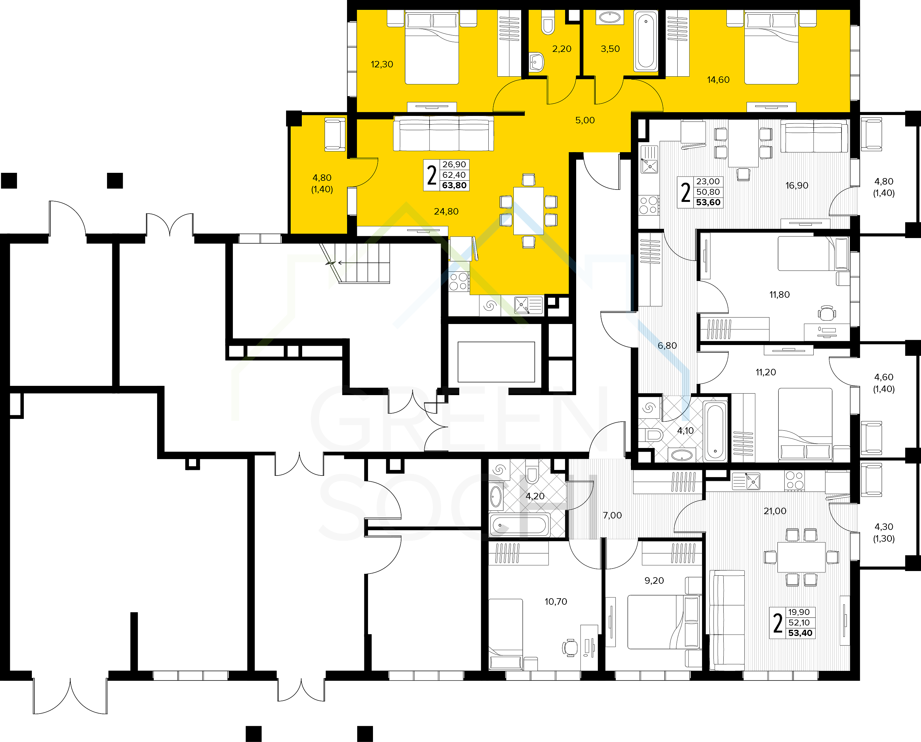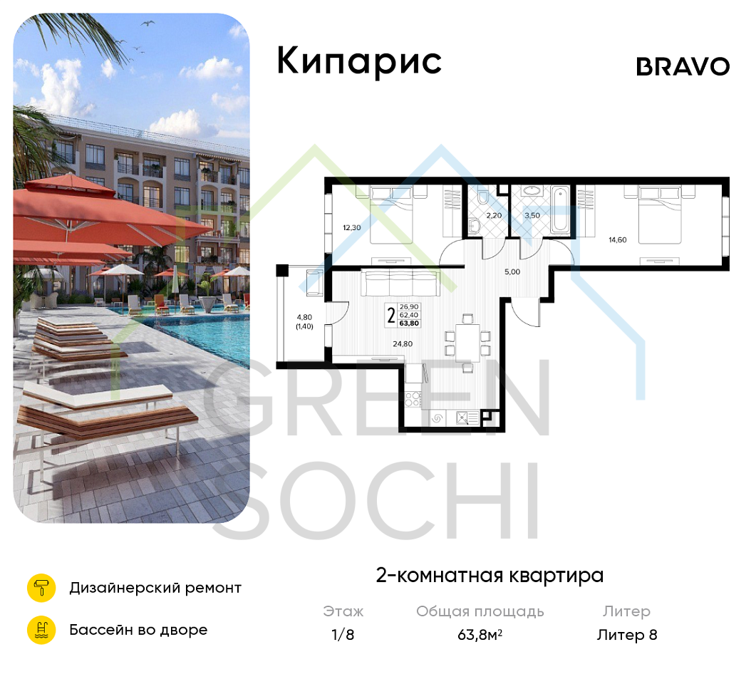 2-к квартира, 63 кв.м., в ЖК Кипарис (Холидей Хаус) (№14863)