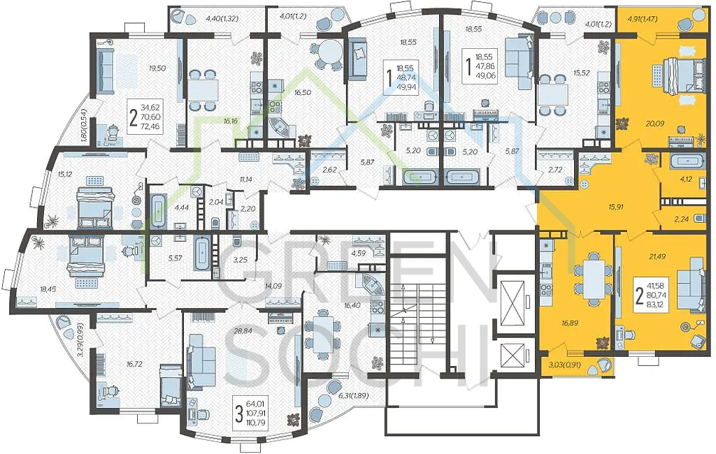 От 4-х до 7 квартир на этаже. Одно из важных преимуществ при выборе квартиры – не много соседей рядом.Лифт, который спускается в подземный паркинг и больше количество парковочных мест сделает жизнь в ЖК “Режиссёр” еще комфортнее!