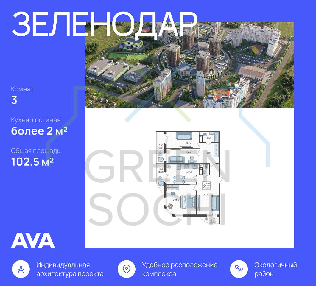 Жилой комплекс находится в одном из самых зелёных районов Краснодара. При этом сюда легко добраться на личном и общественном транспорте Здесь продумана каждая деталь для комфортной и здоровой жизни. Современная архитектура, квартиры с продуманной планировкой, зоны отдыха, спортивные площадки, безопасные дворы и 3 многоуровневые парковки по 500 мест.