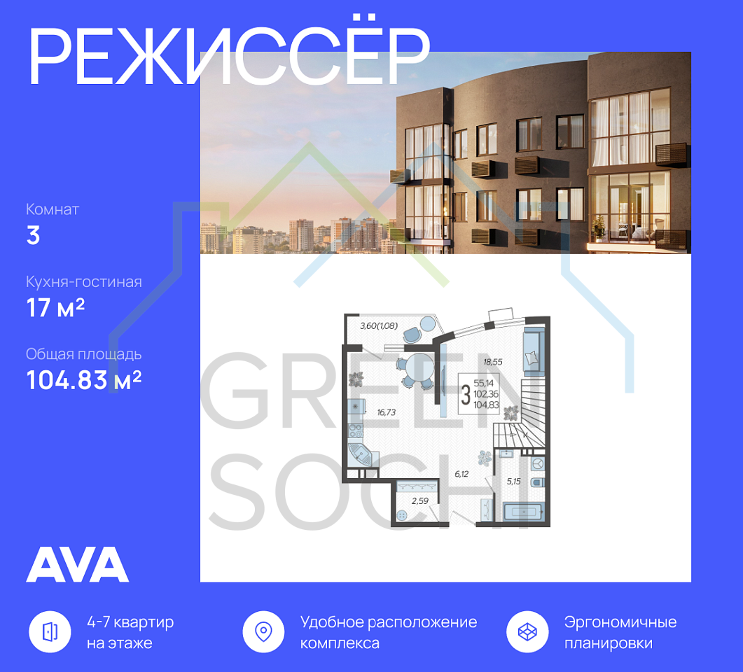 3-к квартира, 104 кв.м., в ЖК Режиссер (№13864)