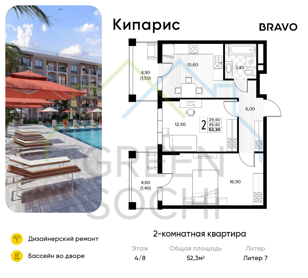 2-к квартира, 52.3 кв.м., в ЖК Кипарис (Холидей Хаус) (№18470)