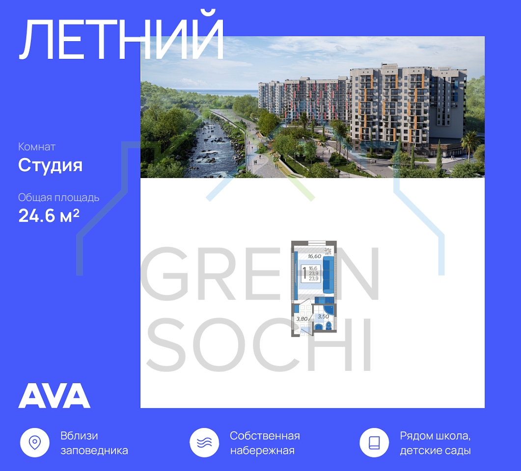 Жилой комплекс "Летний" расположен в ущелье реки Кудепста. В пешей минутной доступности – детские сады и школы. Удобный выезд к железнодорожному вокзалу и аэропорту. За 15 минут можно доехать до Олимпийского парка. ЖК “Летний” - это комплексная застройка из семи 12-этажных домов, который находится в долине реки Кудепста, с собственной набережной, видом из окон на море и горы, многоуровневым паркингом с эксплуатируемой кровлей, современными детскими и спортивными площадками. Рядом расположен заповедник, где берут начало туристические тропы на самые красивые водопады региона, единственная в России тисо-самшитовая роща.