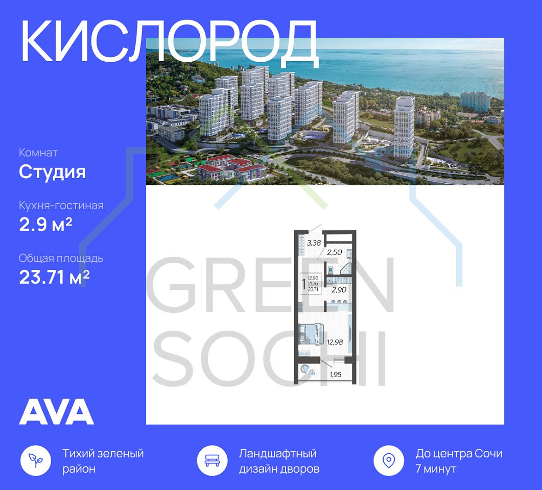 Продается студия в новостройке ЖК "Кислород" Литер 14. Общая площадь квартиры - 23.71 кв. м., этаж 4 из 19. Преимущества квартиры: совмещённый санузел, лоджия Без отделки, но с возможностью заказать отделку.