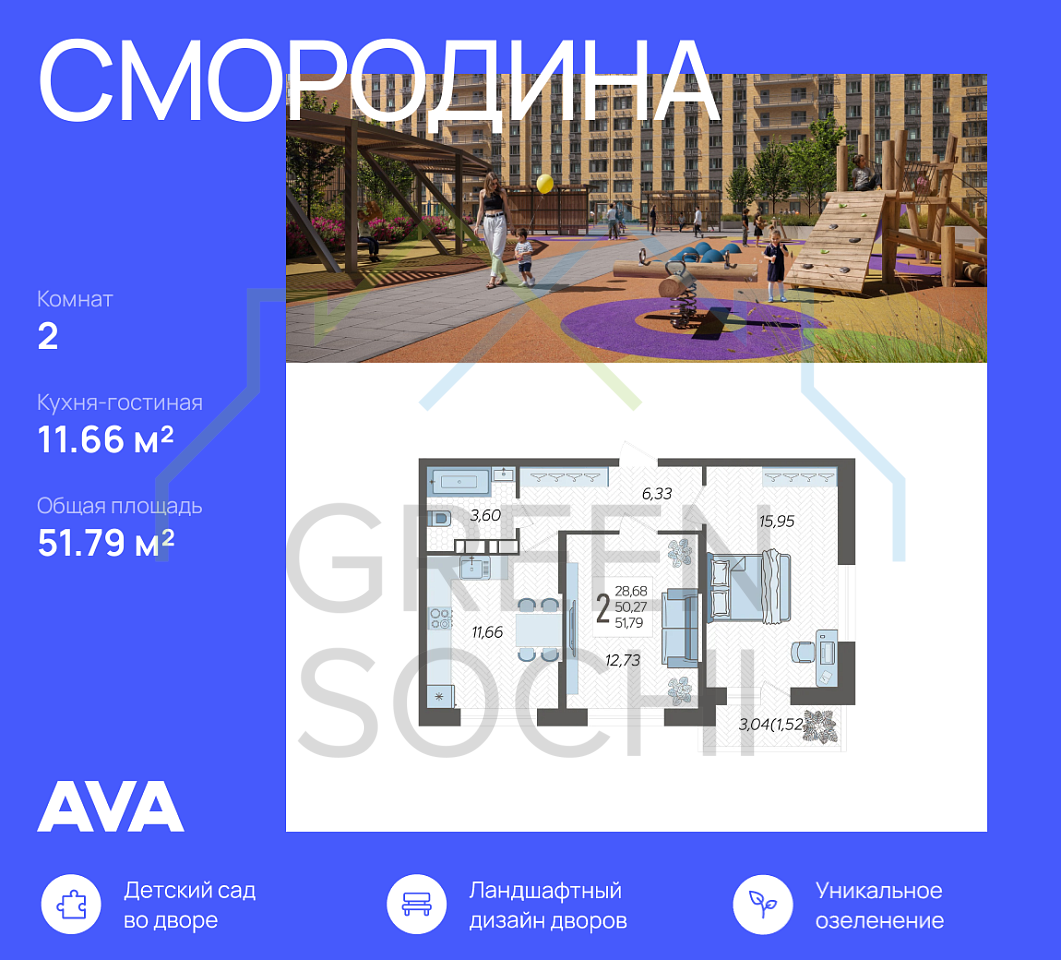 2-к квартира, 51.8 кв.м., в ЖК Смородина (№18490)