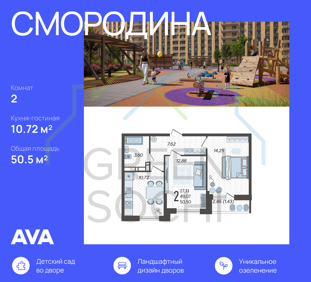 Общая площадь 50.5 м2