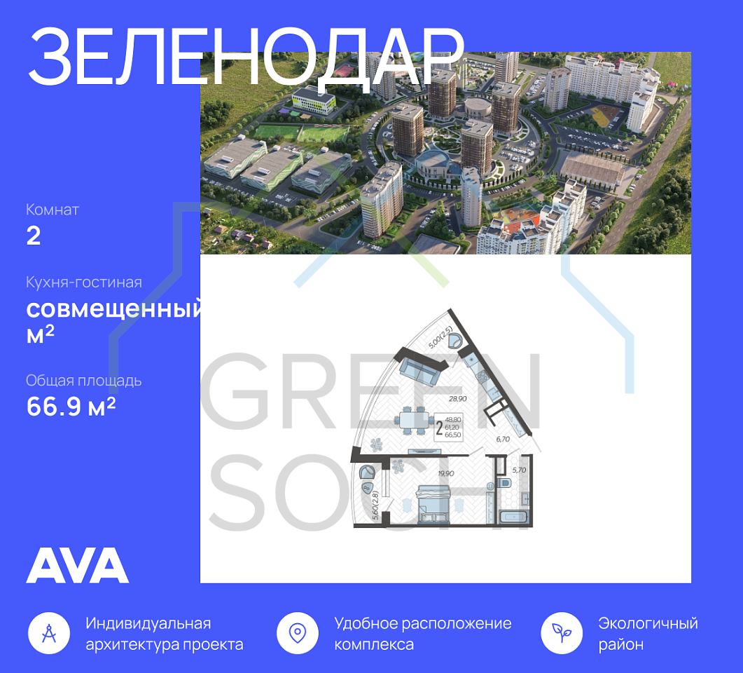 Продаётся 2-комнатная квартира в доме комфорт-класса Зеленодар (Литер 5б), сроком сдачи: 1 кв. 2023, общей площадью 66.9 кв.м., на 16 этаже. Предчистовая отделка, но с возможностью заказать отделку.
