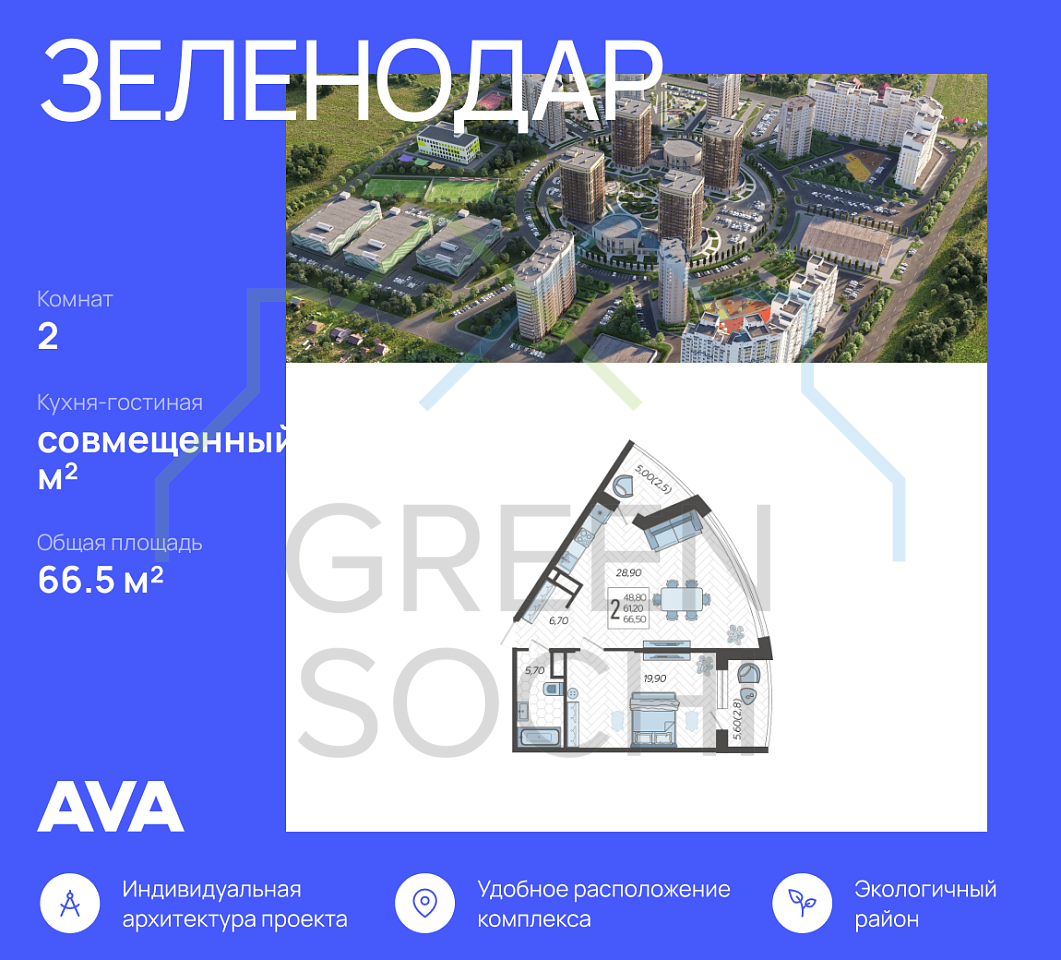 Продаётся 2-комнатная квартира в доме комфорт-класса Зеленодар (Литер 5а), сроком сдачи: 1 кв. 2023, общей площадью 66.5 кв.м., на 14 этаже. Предчистовая отделка, но с возможностью заказать отделку.