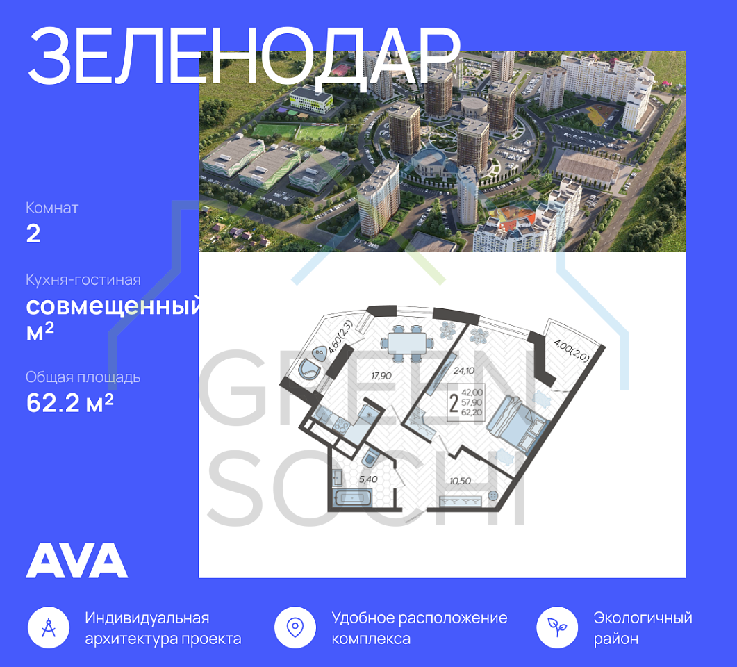 Продаётся 2-комнатная квартира в доме комфорт-класса Зеленодар (Литер 5а), сроком сдачи: 1 кв. 2023, общей площадью 62.2 кв.м., на 16 этаже. Предчистовая отделка, но с возможностью заказать отделку.
