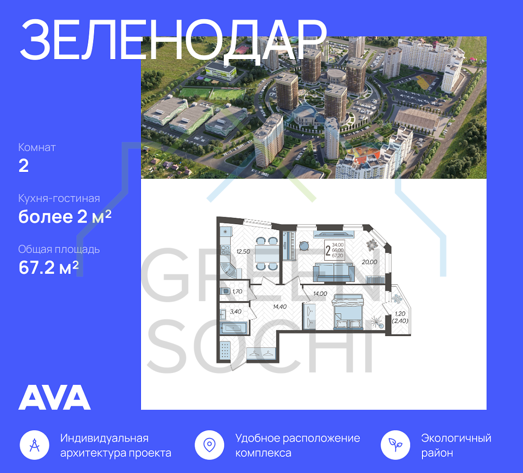 Продаётся 2-комнатная квартира в доме комфорт-класса Зеленодар (Литер 7), сроком сдачи: 1 кв. 2023, общей площадью 67.2 кв.м., на 3 этаже. Предчистовая отделка, но с возможностью заказать отделку.