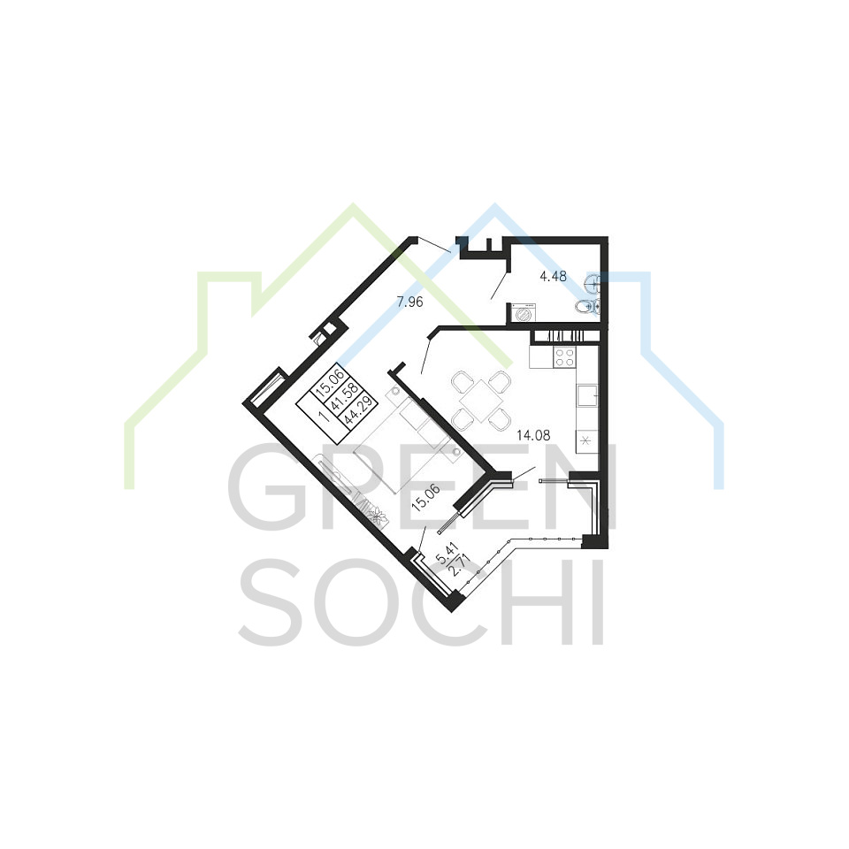 Общая площадь 44.29 м2