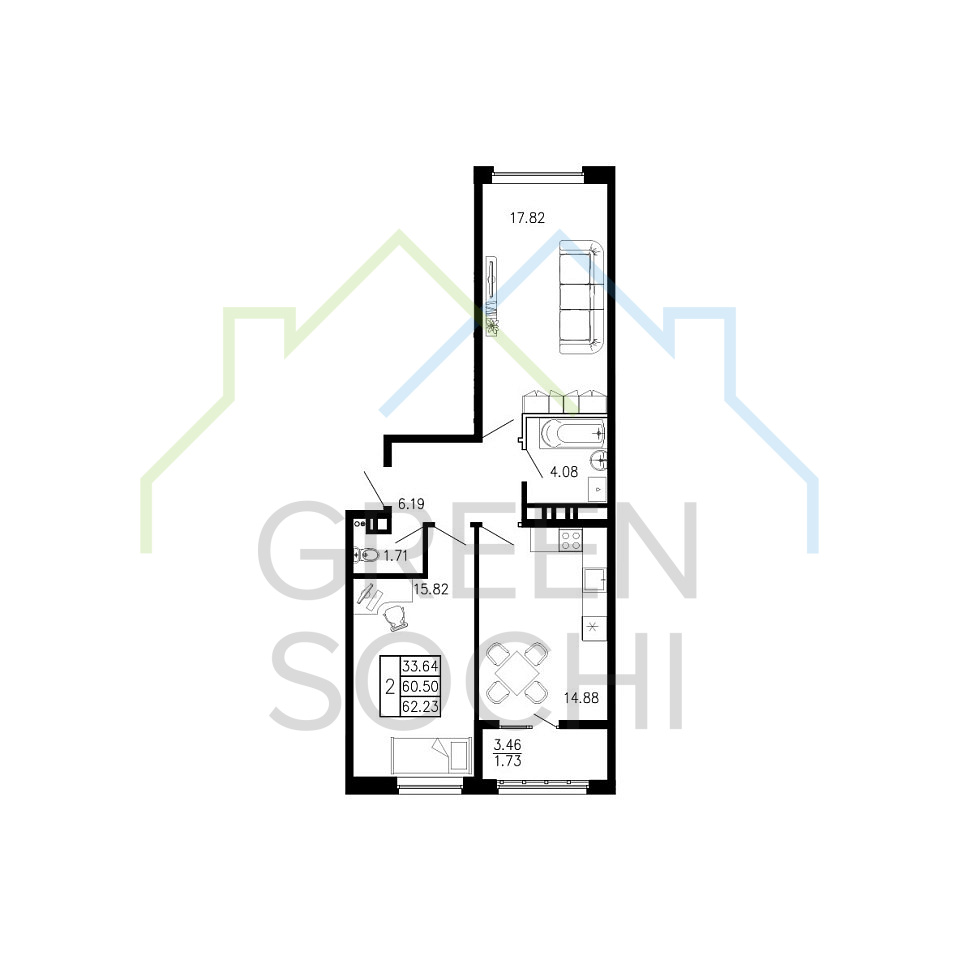 2-к квартира, 62.2 кв.м., в ЖК Просторы Крыма (№18514)