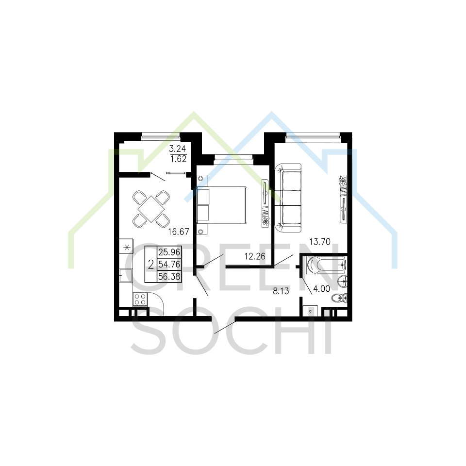 Общая площадь 56.38 м2