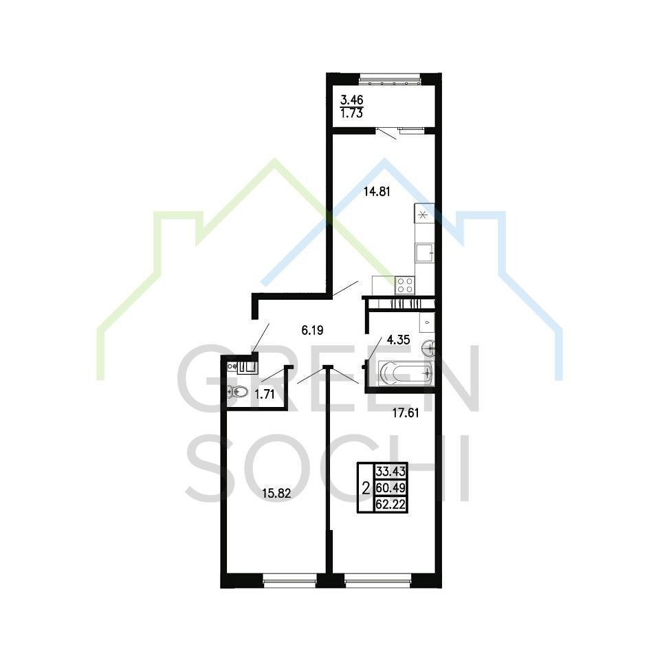 Общая площадь 62.22 м2