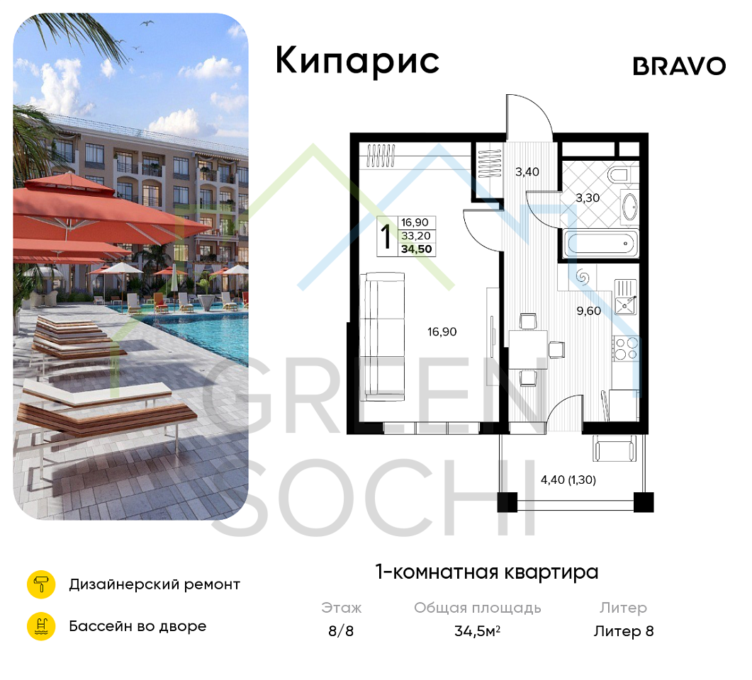 1-к квартира, 34.5 кв.м., в ЖК Кипарис (Холидей Хаус) (№16451)