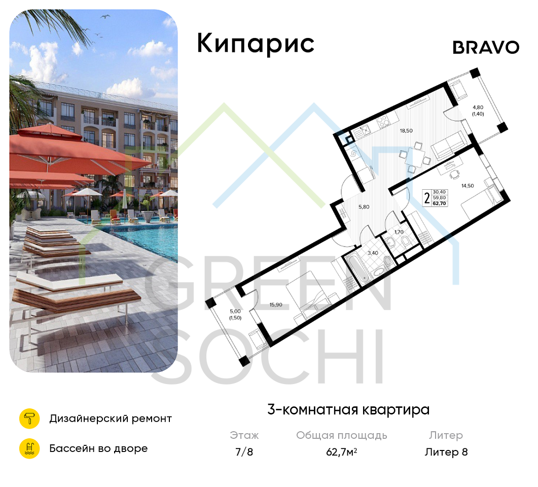 Общая площадь 62.7 м2
