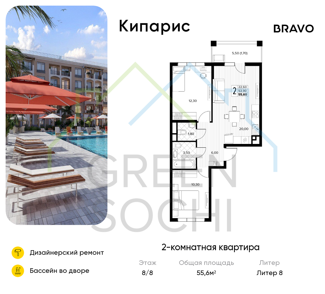 2-к квартира, 55.6 кв.м., в ЖК Кипарис (Холидей Хаус) (№16440)