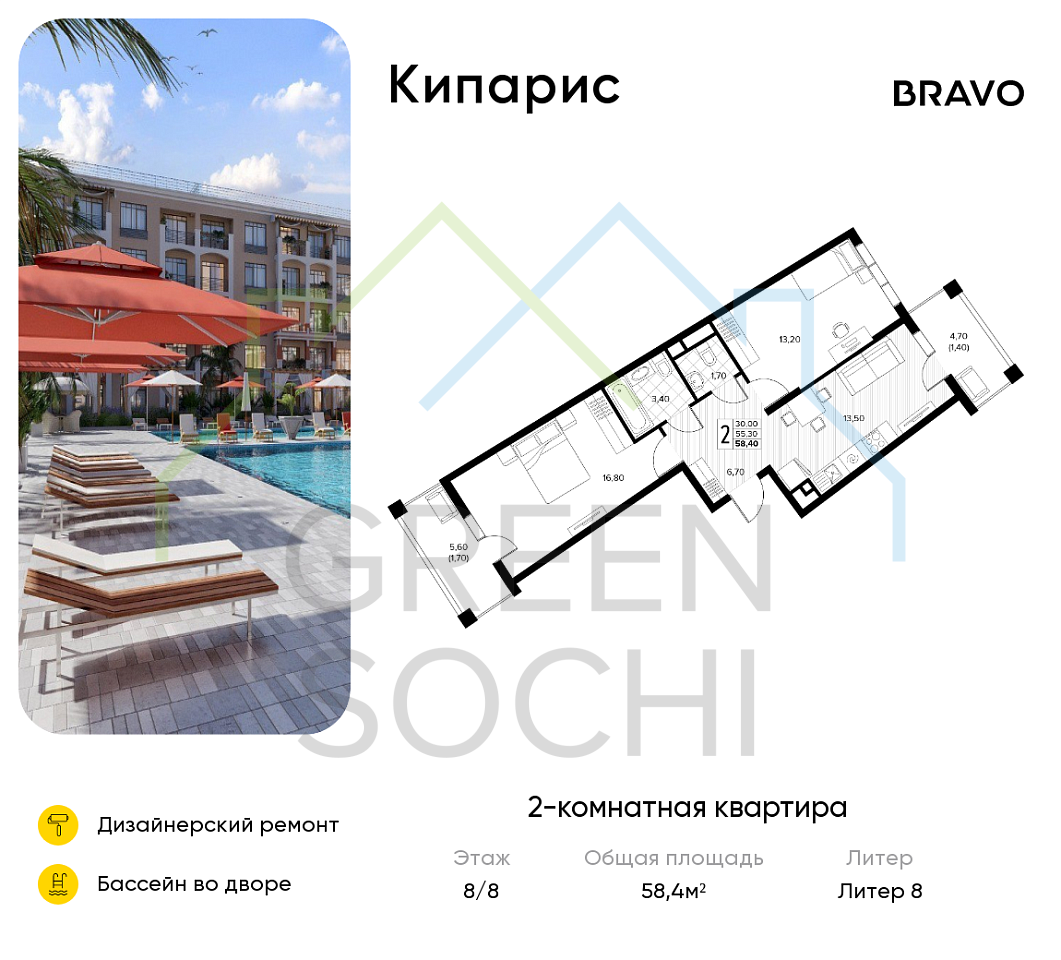 2-к квартира, 58.4 кв.м., в ЖК Кипарис (Холидей Хаус) (№16448)