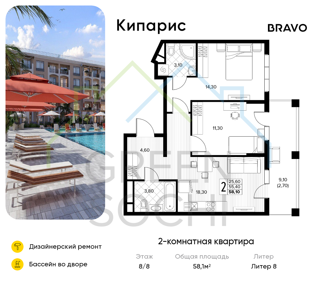 2-к квартира, 58.1 кв.м., в ЖК Кипарис (Холидей Хаус) (№16442)