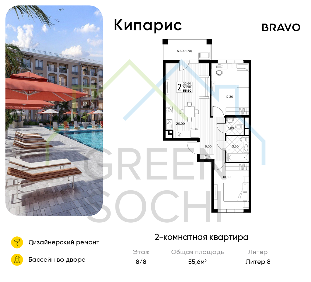 2-к квартира, 55.6 кв.м., в ЖК Кипарис (Холидей Хаус) (№16449)
