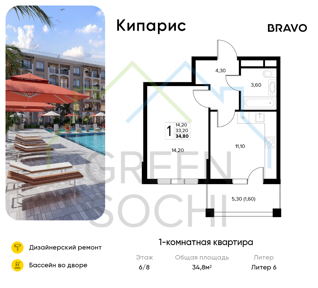 1-к квартира, 34.8 кв.м., в ЖК Кипарис (Холидей Хаус) (№18417)