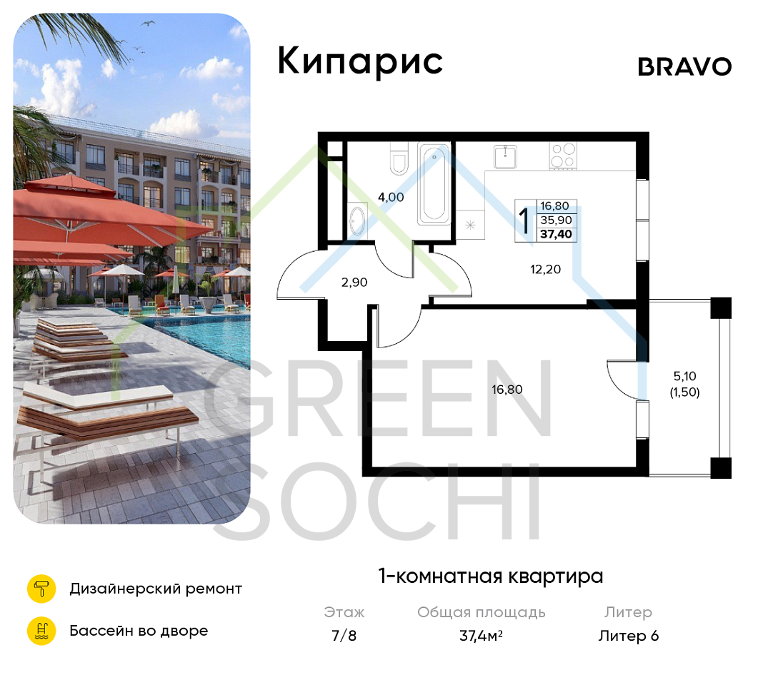 1-к квартира, 37.4 кв.м., в ЖК Кипарис (Холидей Хаус) (№18543)