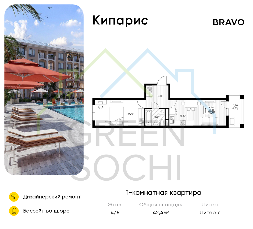 1-к квартира, 42.4 кв.м., в ЖК Кипарис (Холидей Хаус) (№18467)