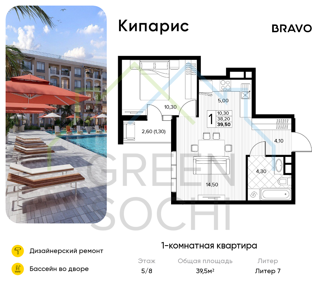 1-к квартира, 39.5 кв.м., в ЖК Кипарис (Холидей Хаус) (№18550)