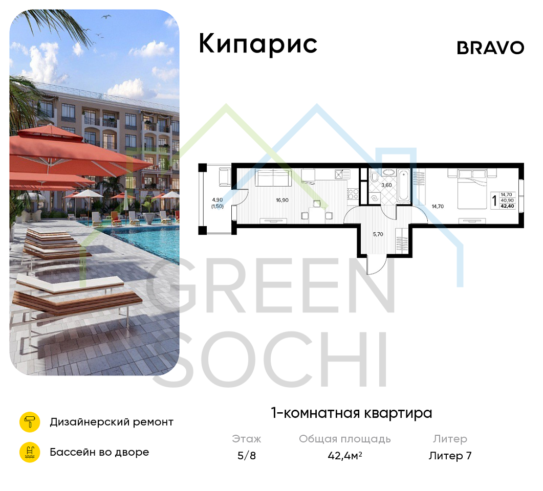 1-к квартира, 42.4 кв.м., в ЖК Кипарис (Холидей Хаус) (№18473)
