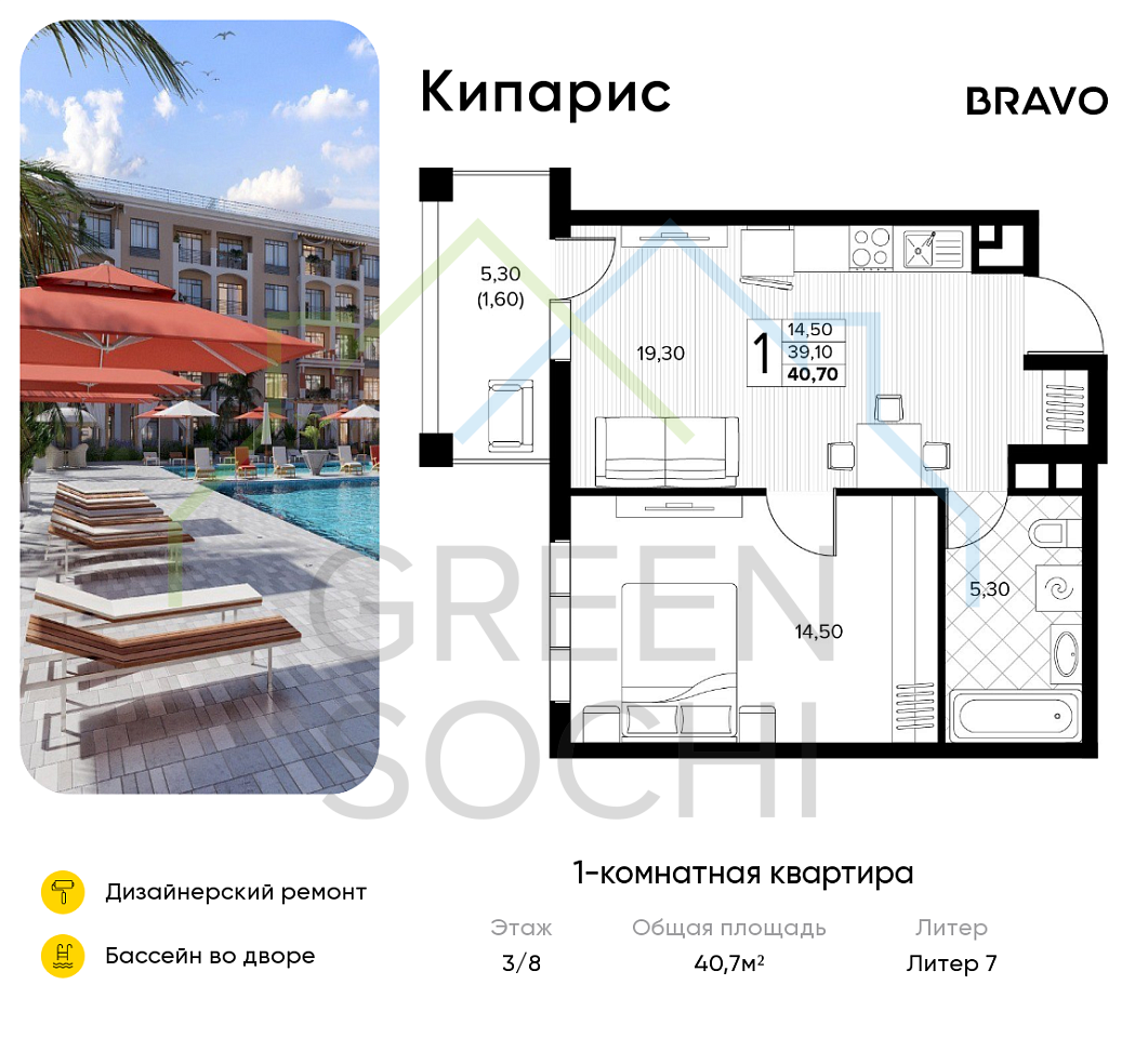 1-к квартира, 40.7 кв.м., в ЖК Кипарис (Холидей Хаус) (№18546)