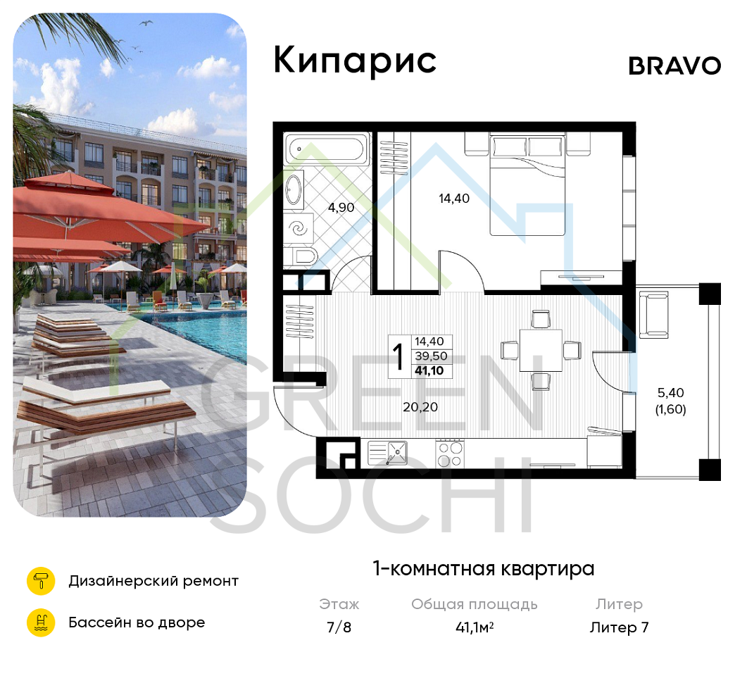 1-к квартира, 41.1 кв.м., в ЖК Кипарис (Холидей Хаус) (№16412)