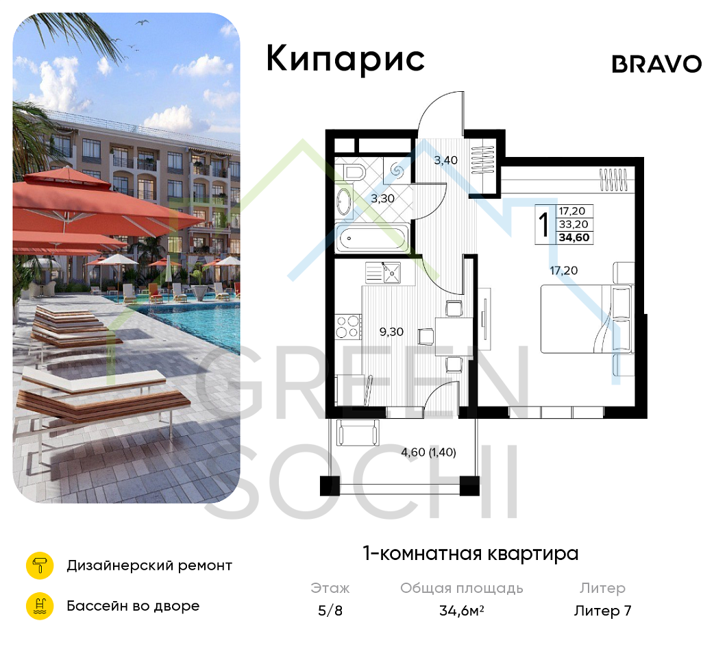 1-к квартира, 34.6 кв.м., в ЖК Кипарис (Холидей Хаус) (№18474)