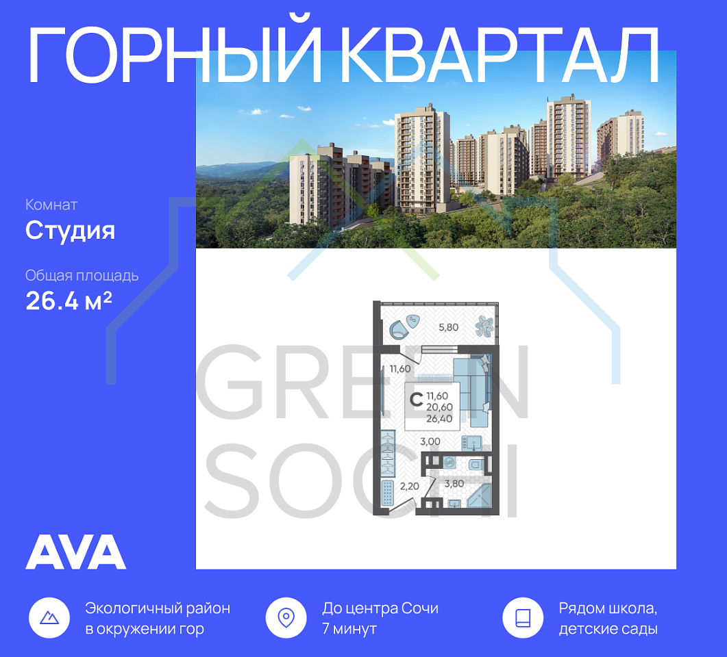 Продается студия в доме (Литер 4), срок сдачи : 3 кв. 2026, общей площадью 26.4 кв.м., на 13 этаже в новом современном жилом комплексе в Сочи «Горный квартал», Хостинский район. Отличный вариант для инвестиций и жизни.