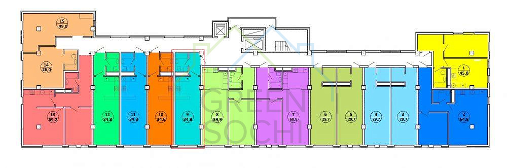 На 9-ти этажах комплекса расположено 107 квартир площадью от 26,6 до 117,6 кв. м. Жилые помещения продаются с черновой отделкой.